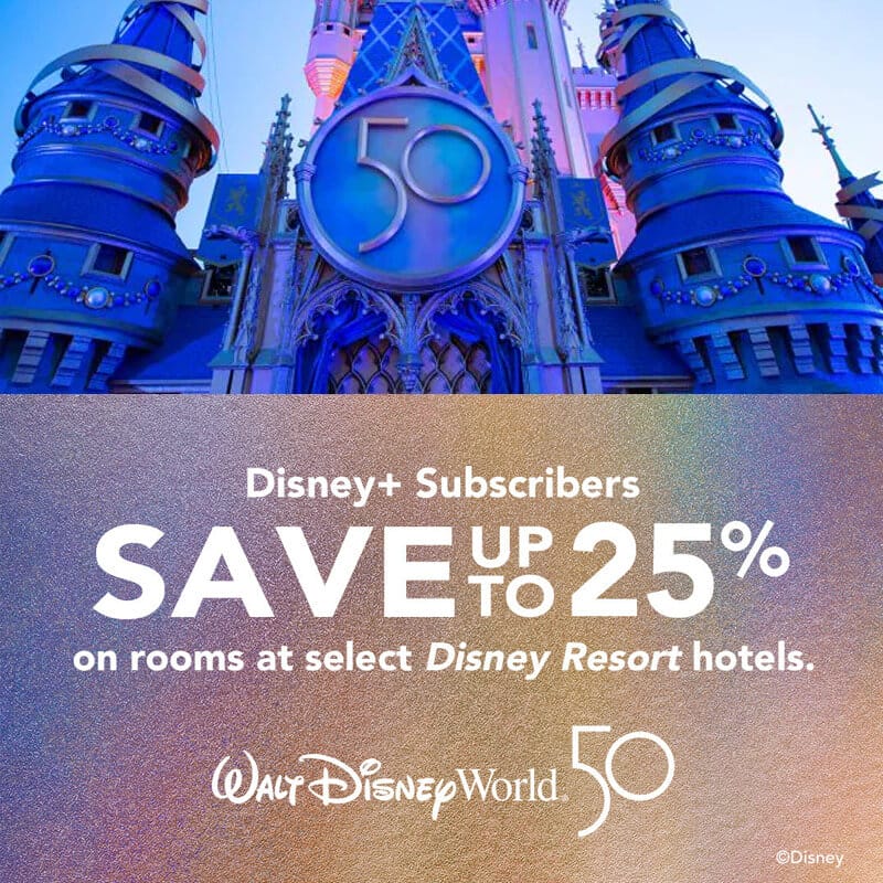 Disney+ subscribers can save up to 25% on rooms at select Disney Resort hotels for stays most nights July 8 through September 30, 2022.