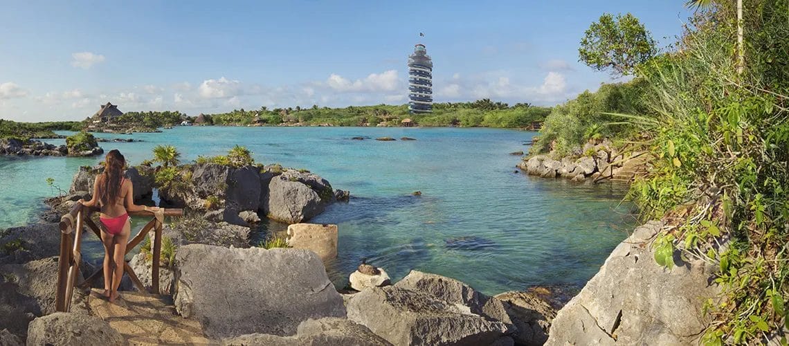 Xel-HÑ park is a place to flow with nature. Snorkel freely in a river surrounded by mangroves, whose waters mix with the coveβs and flow into the Caribbean Sea. Watch different species of land and sea animals while enjoying fun activities for all ages. From any point ofΒ Xel-HΓ‘, you can admire astounding landscapes of the jungle, crystal-clear waters, and receive the sun. Atop the Scenic Lighthouse at 131 ft (40m) tall, you can admire 360Β° views of nature in all its splendor, to then descend on a waterslide that ends in a natural pool.Β